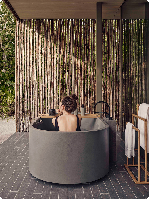 Alone or together, immerse in the serenity of your oversized outdoor bathtub
