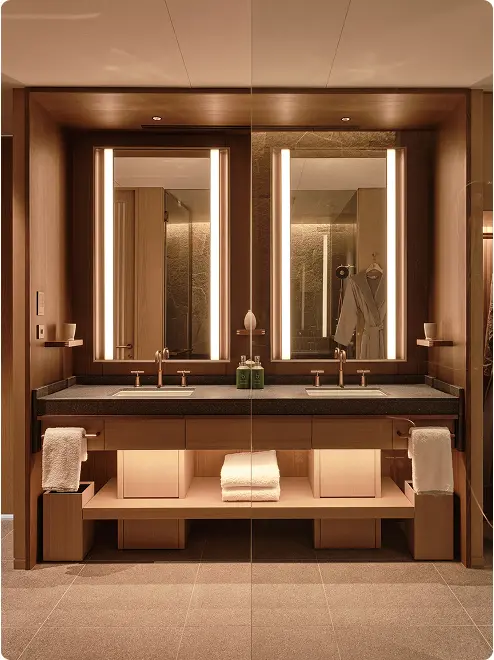 50平方メートルの広さを誇るデラックスルームは、休息をとったり絆を深めたりするのに最適なゆったりとした空間です。壮麗な大阪城を望む絶景、またはエネルギーに満ちあふれる都市のリアルな景観をお楽しみください
