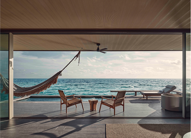 - Floor-to-ceiling windows on three sides of villa with blackout blinds