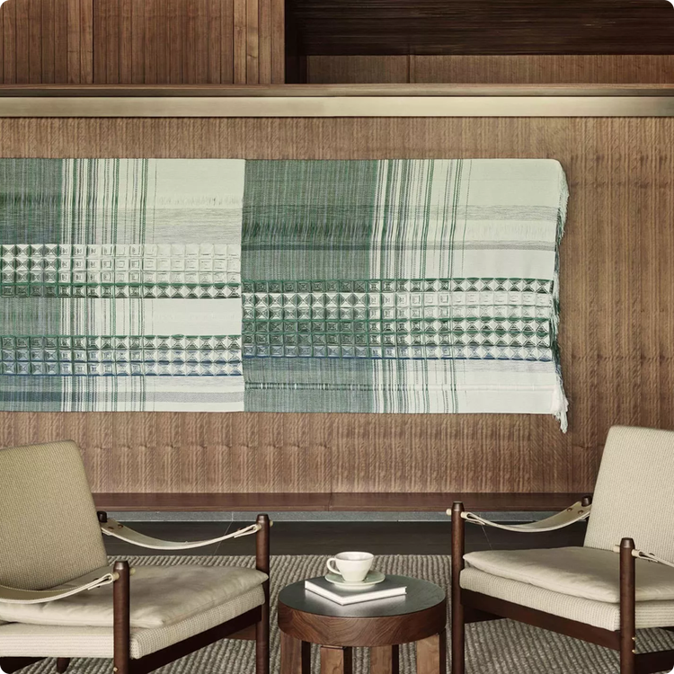 Das nahe Meer und der ferne Himmel verschmelzen zu einer sanften blauen Weite. Dieses Textilkunstwerk experimentiert mit Perspektiven und entführt uns in eine dreidimensionale Sichtweise - lateral, vertikal und topografisch -, sodass wir die Natur als allumfassenden Frieden erleben.