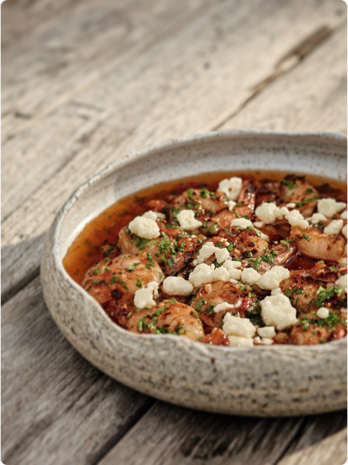 Garnelen, sautiert in einer Skordalia aus Tomaten und getrockneten Chilischoten, garniert mit Feta