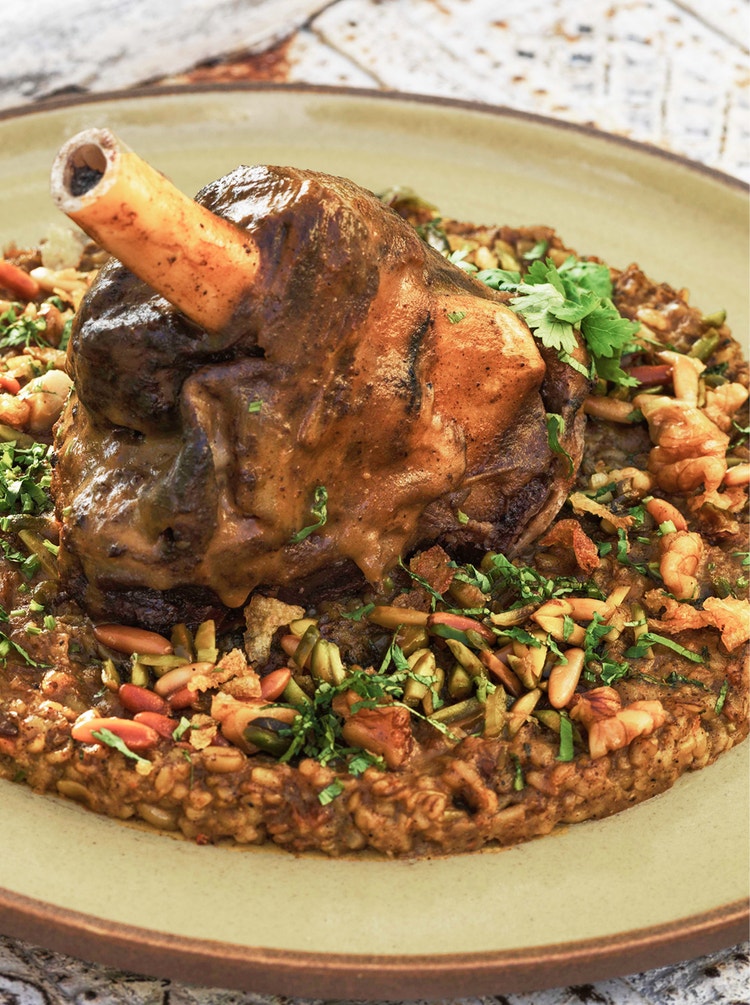 Braised angus beef short ribs atop a bed of aromatic spiced couscous