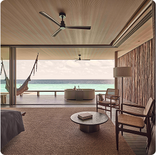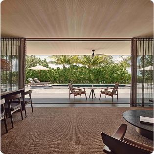 - ヴィラの3面にある床から天井までの窓には、遮光ブラインドを設置
