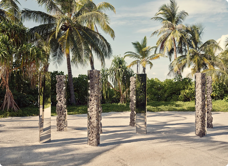 这件作品将原始砂岩巨石与由 recinto 火山岩制成的石块并置。recinto 石块的有序结构与巨石的随性形态形成微妙张力,似乎随时都可能打破平衡。激发观众思考任何形态中秩序与混沌的共存状态