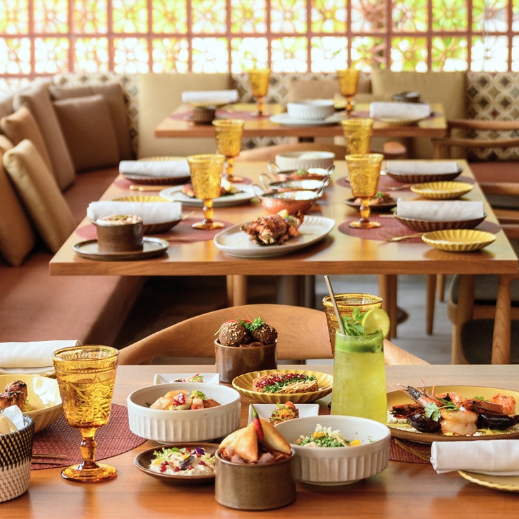 Arabesque 餐厅以贝都因帐篷为灵感,用黎巴嫩风格的造型、质感与色彩营造独特氛围。品味地道的中东与北印度风味,巧妙融入现代烹饪手法