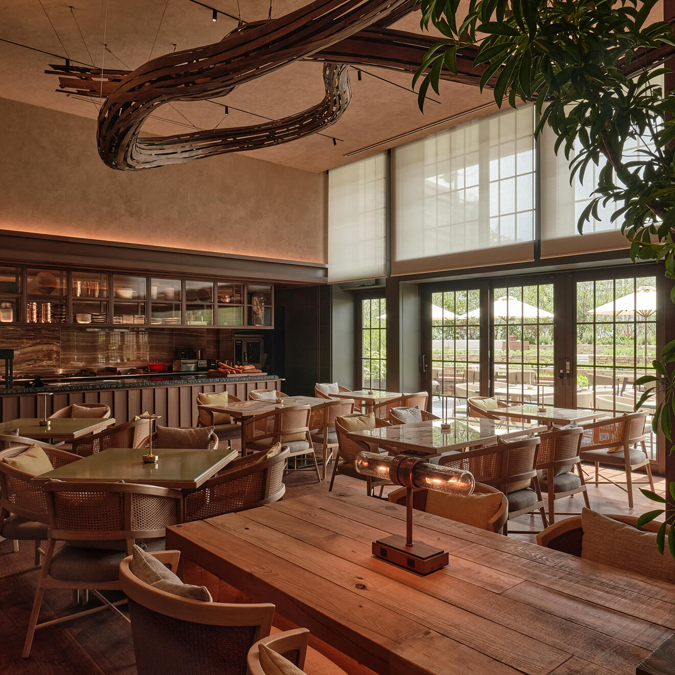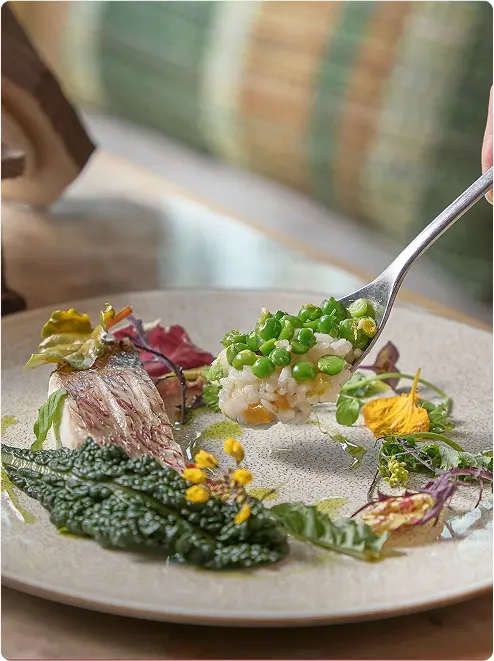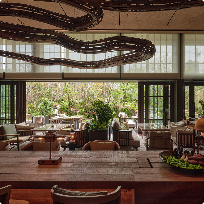 Inspired by the 72 kō (micro-seasons) of the Japanese calendar, P72 invites a slower way of seeing, tasting, and being. The restaurant embraces the belief that change is constant and worth noticing. Each dish is guided by what nature offers now, prepared with care and served with the land in mind. A 52-metre sculptural installation made from reclaimed wood greets you on arrival, its form evoking roots; a quiet reminder of what the land provides. For those wishing to enjoy the experience in the open air, our spacious terrace offers a peaceful, outdoor setting where pets are welcome too