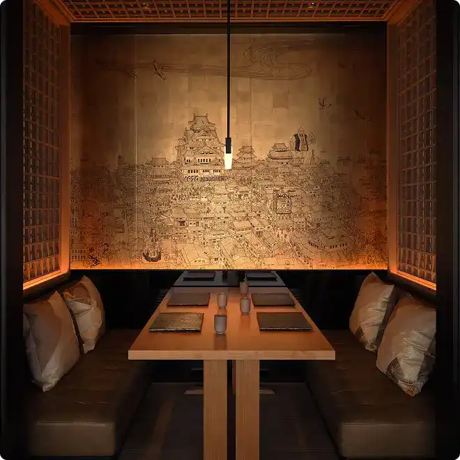 19階に位置する「馬藺」では、大阪の街並みとスカイラインを一望する眺望をお楽しみいただけます。レストランの名は、強さと優雅さを象徴する花・菖蒲に由来し、大阪城の伝説的な武将・豊臣秀吉にもゆかりがあります。目の前で繰り広げられるのは、日本各地から厳選された旬の食材を、職人が一皿ずつ丁寧に仕上げる鉄板焼。その所作の一つひとつに、侍のような研ぎ澄まされた精神が息づいています。