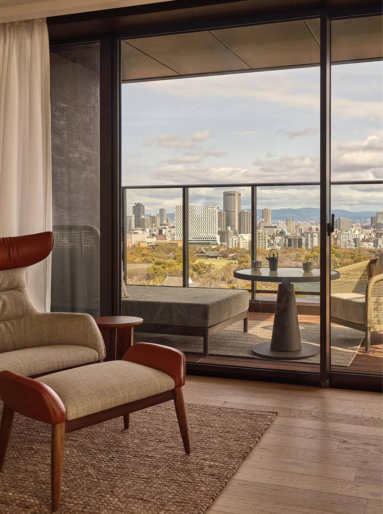 발코니 옆에 기대앉아 감상하는 오사카의 풍광