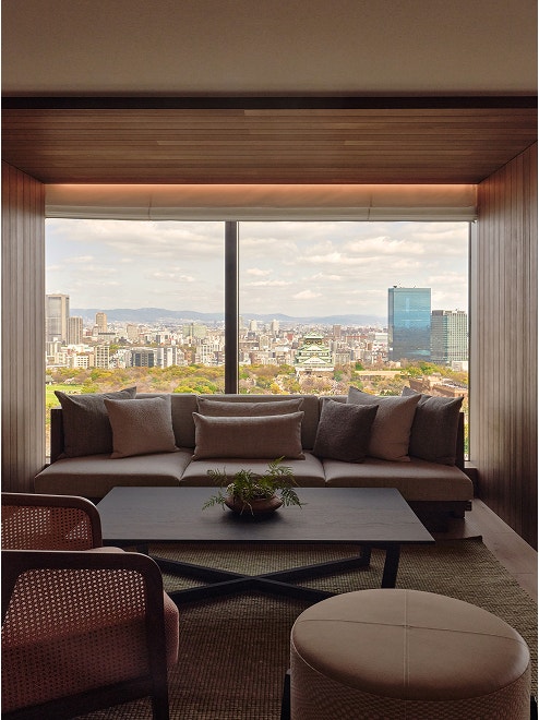 A sofa set against the Osaka skyline offers space to relax, reconnect, and share moments with loved ones